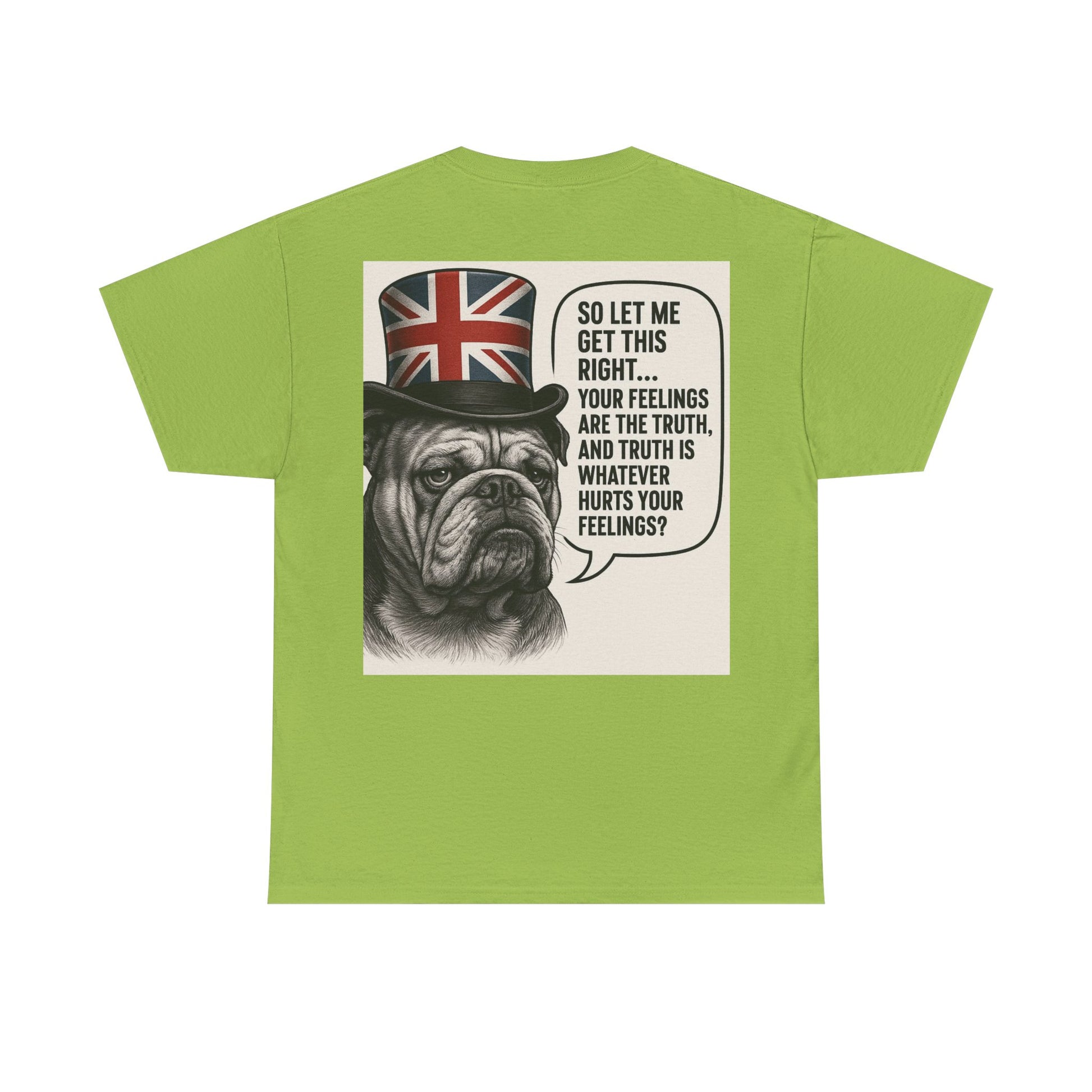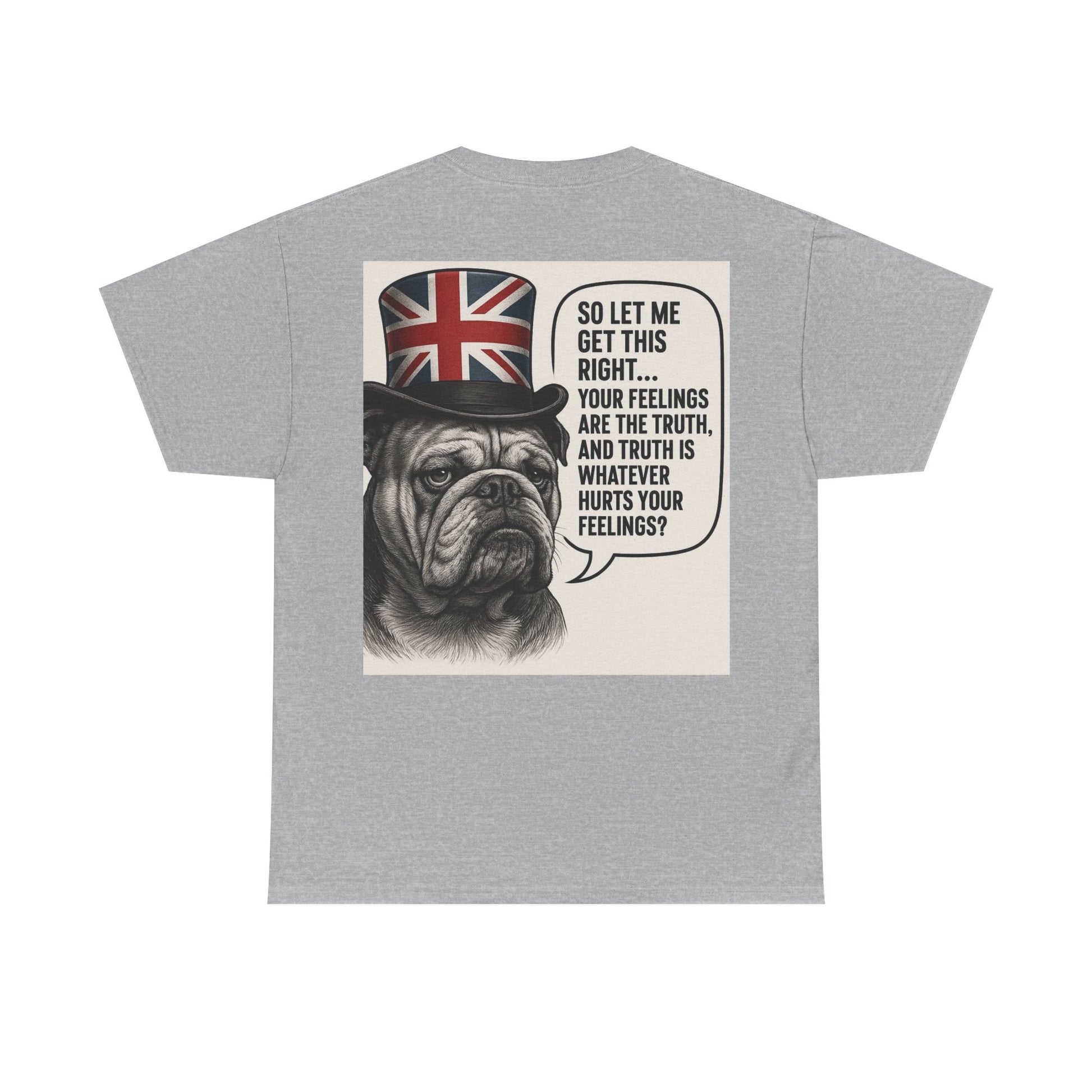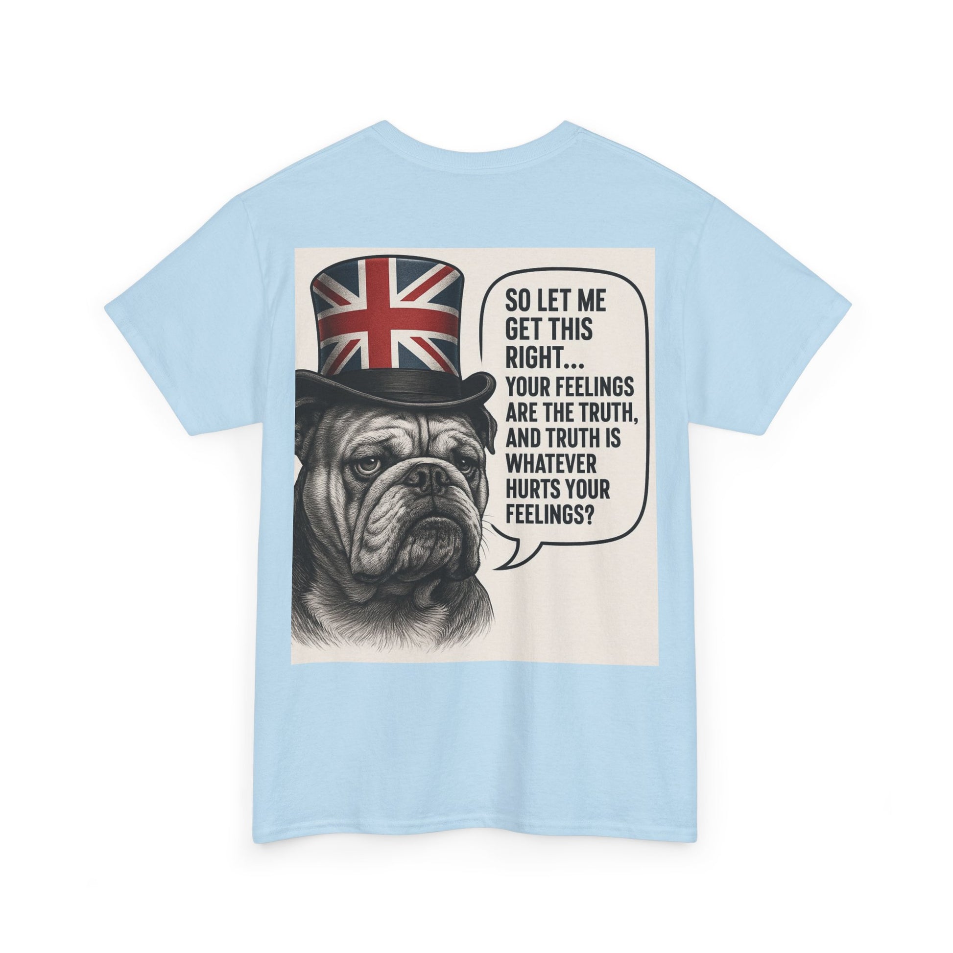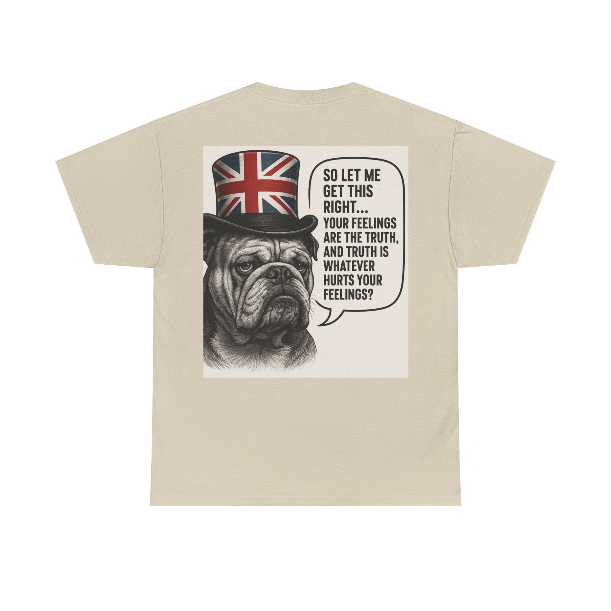 This relaxed-fit tee carries a wry, vintage-feel print that reads like a private joke for people who appreciate dry humor and bold graphic statements. The soft, medium-weight cotton sits comfortably against the skin while the ribbed collar and tubular knit construction keep the silhouette tidy wash after wash. On the back, a detailed bulldog illustration wearing a Union Jack top hat frames a speech bubble with an ironic line — it’s the kind of design that sparks a smile and a conversation. Wear it on casual days, to low-key meetups, or when you want to add a bit of cheeky charm to your weekend rotation.