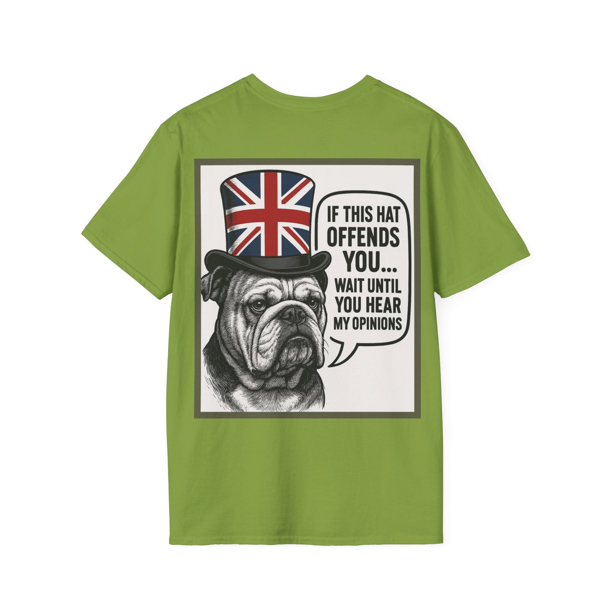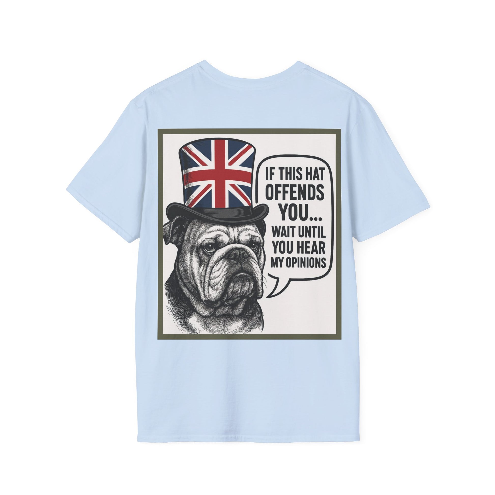 This lightweight cotton tee carries a cheeky, proudly British vibe — a grumpy bulldog wearing a Union Jack top hat with the speech bubble: “If this hat offends you... wait until you hear my opinions.” It sits on a clean white canvas so the artwork pops, and the classic crew neckline and tailored fit keep the silhouette everyday-wearable. Wear it to spark conversation at a pub quiz, while exploring a city market, or when you want to make a dry, humorous statement without saying a word. The cotton is soft against skin and holds print detail well, so the illustration stays crisp through many washes. Subtle design, bold personality — for people who enjoy irony, dry wit, and a touch of nostalgic British character in their wardrobe.