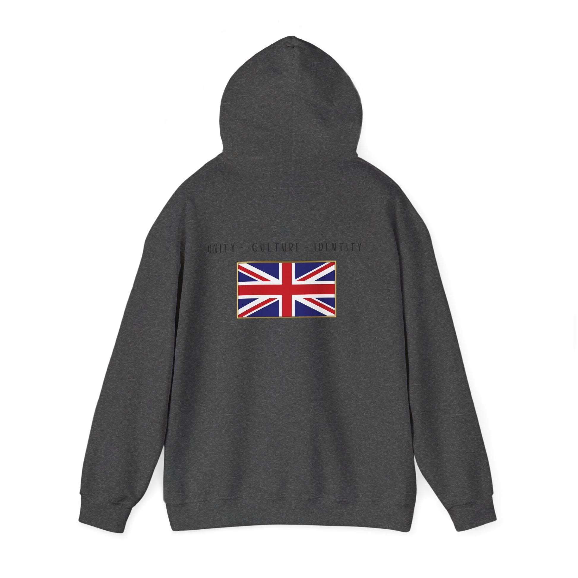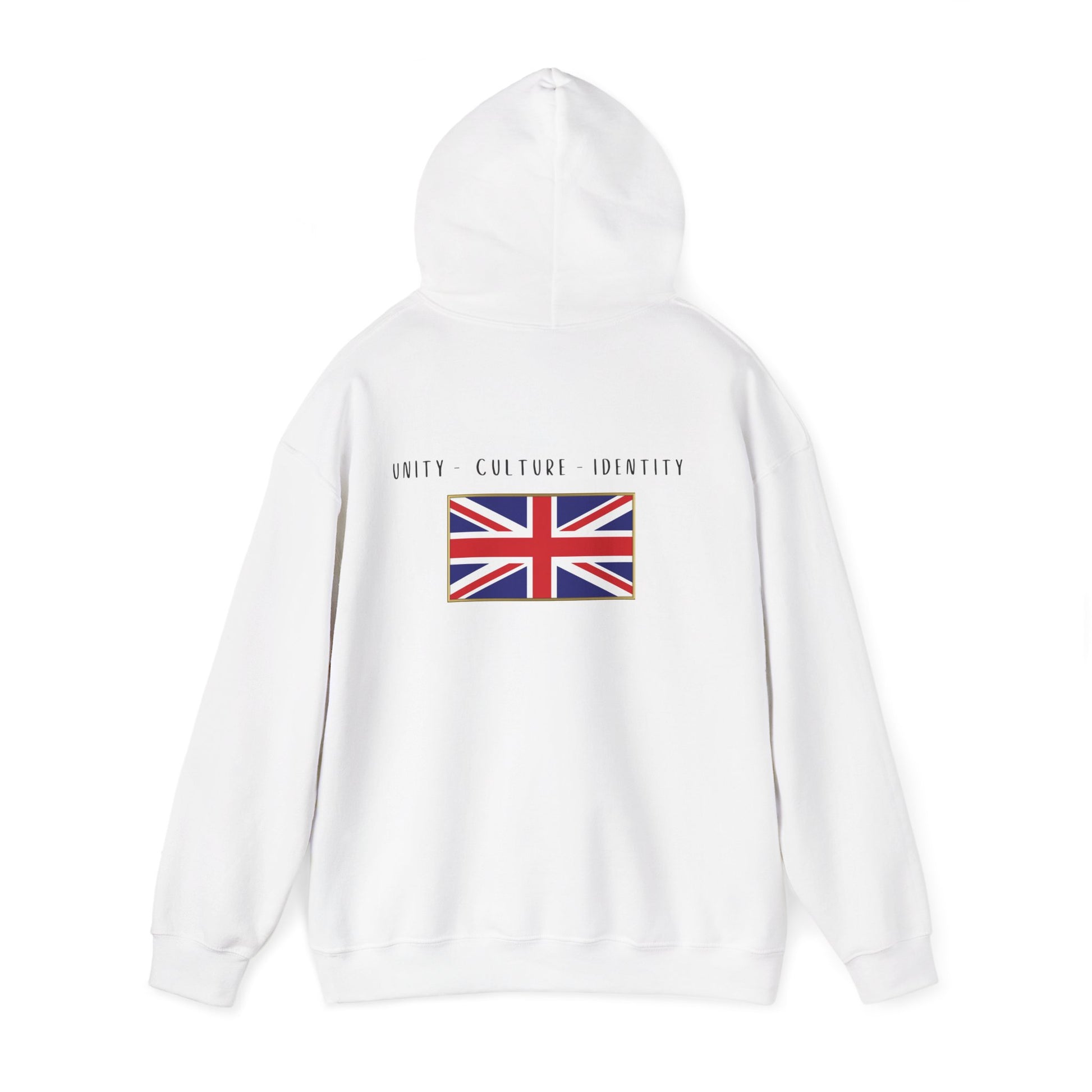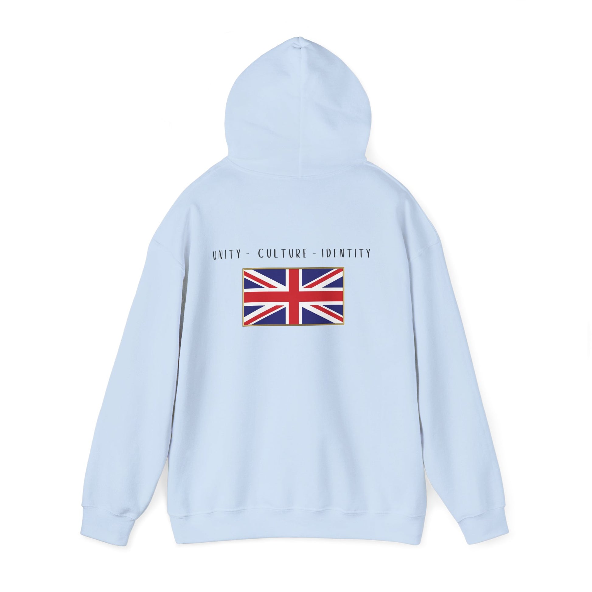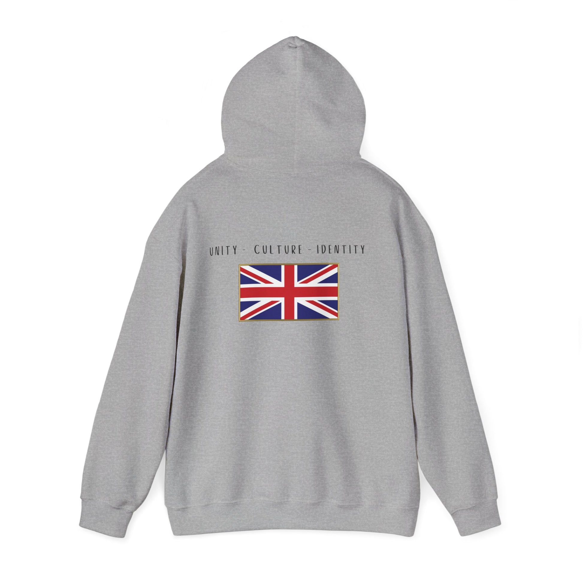 This roomy hooded sweatshirt wraps you in a quiet, familiar comfort while carrying a subtle nod to British heritage. The soft, medium-heavy cotton-poly blend feels warm without weight. A clean Union Jack sits low on the back beneath a small line of understated text, giving the piece a minimalist, lived-in look that reads as both nostalgic and modern. Slip your hands into the kangaroo pocket, tighten the color-matched drawcord when it’s blustery, and let the double-lined hood and classic fit carry you through weekend walks, travel days, and slow mornings at the cafe.