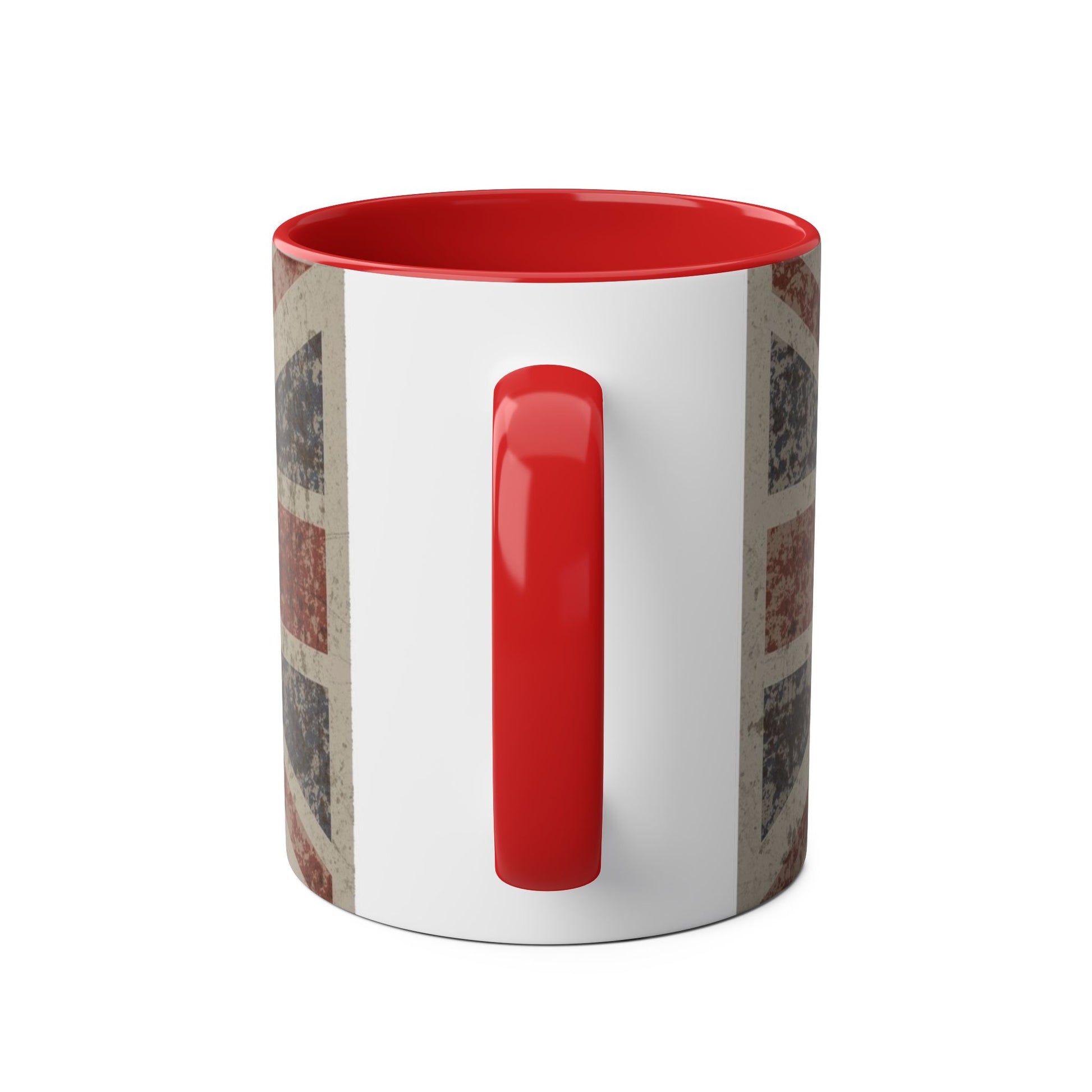 This two-tone ceramic mug carries a worn, proudly British vibe — a faded Union Jack backdrop with a heraldic lion and subtle vintage distressing. The red inner glaze and matching handle bring warmth and contrast to the neutral, weathered print. It sits comfortably in hand thanks to a C-shaped grip and holds a steady 11 oz of coffee, tea, or whatever fuels your morning. Use it on relaxed slow mornings, at a cluttered work desk, or while planning your next trip across town — it adds character to routine moments and quietly announces your fondness for classic British motifs.